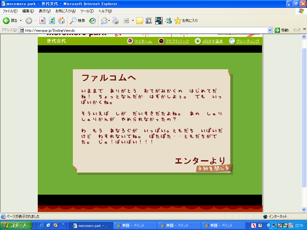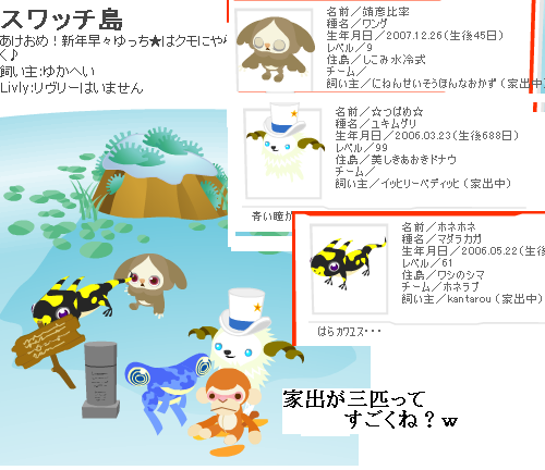 1代目/チコ犬→ 2代目/ヴォルグ→ 3代目/エンター→ 4代目/サンポ。→ 5代目/ニノ→ 6代目/ホムラ→ 7代目/ヒカル→ サービス終了しちゃった・・・